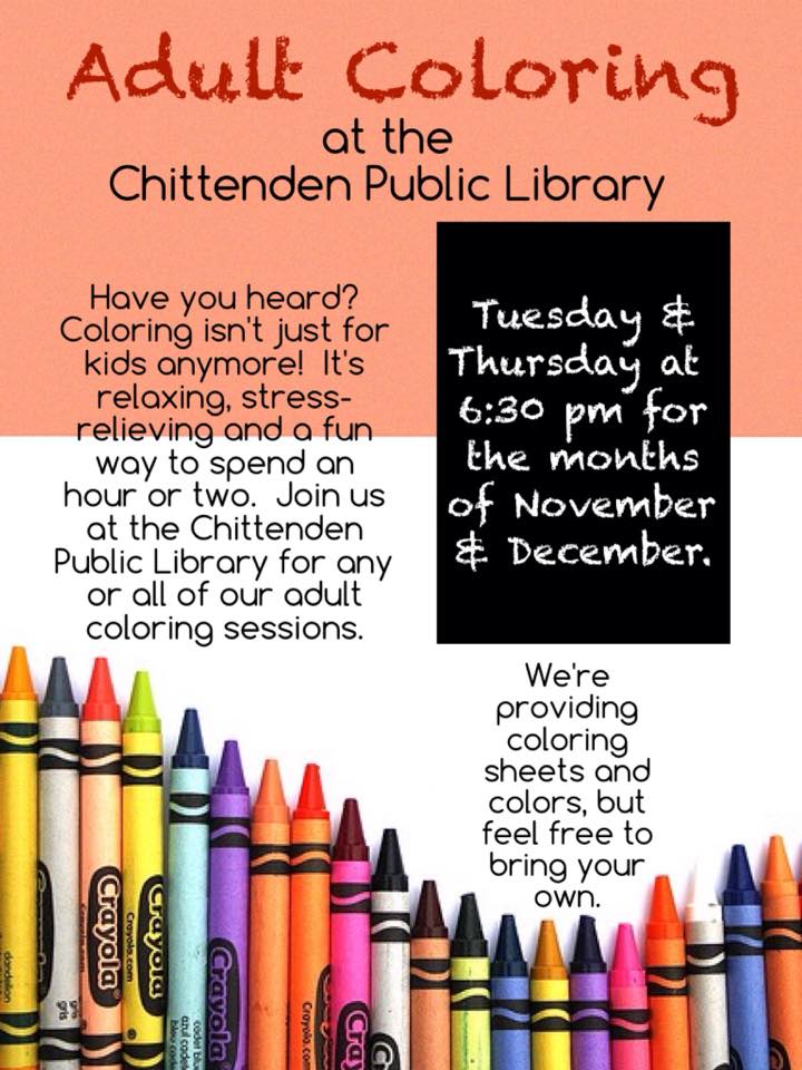 Adult Coloring Sessions Image Posted on October 24, 2015 by chittendenpubliclibrary Share this: Click to share on X (Opens in new window) X Click to share on Facebook (Opens in new window) Facebook Like Loading... Related