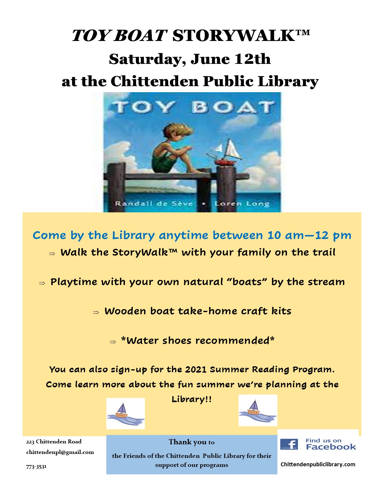 StoryWalk & Summer Reading Sign-Ups Image Posted on June 4, 2021 by chittendenpubliclibrary Share this: Click to share on X (Opens in new window) X Click to share on Facebook (Opens in new window) Facebook Like Loading... Related